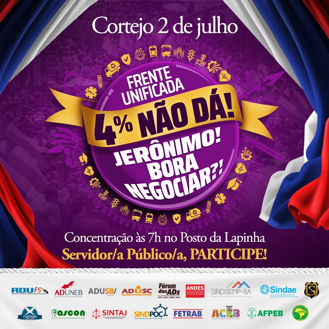 No próximo domingo (2), o Fórum das ADs – que reúne as seções sindicais das quatro universidades estaduais baianas – participará, mais uma vez, do tradicional Cortejo Dois de Julho. Este ano docentes das universidades estaduais da Bahia, do Sudoeste Baiano, de Santa Cruz e de Feira de Santana se somarão ao bloco articulado pela Frente Unificada de Sindicatos do Serviço Público Estadual.
