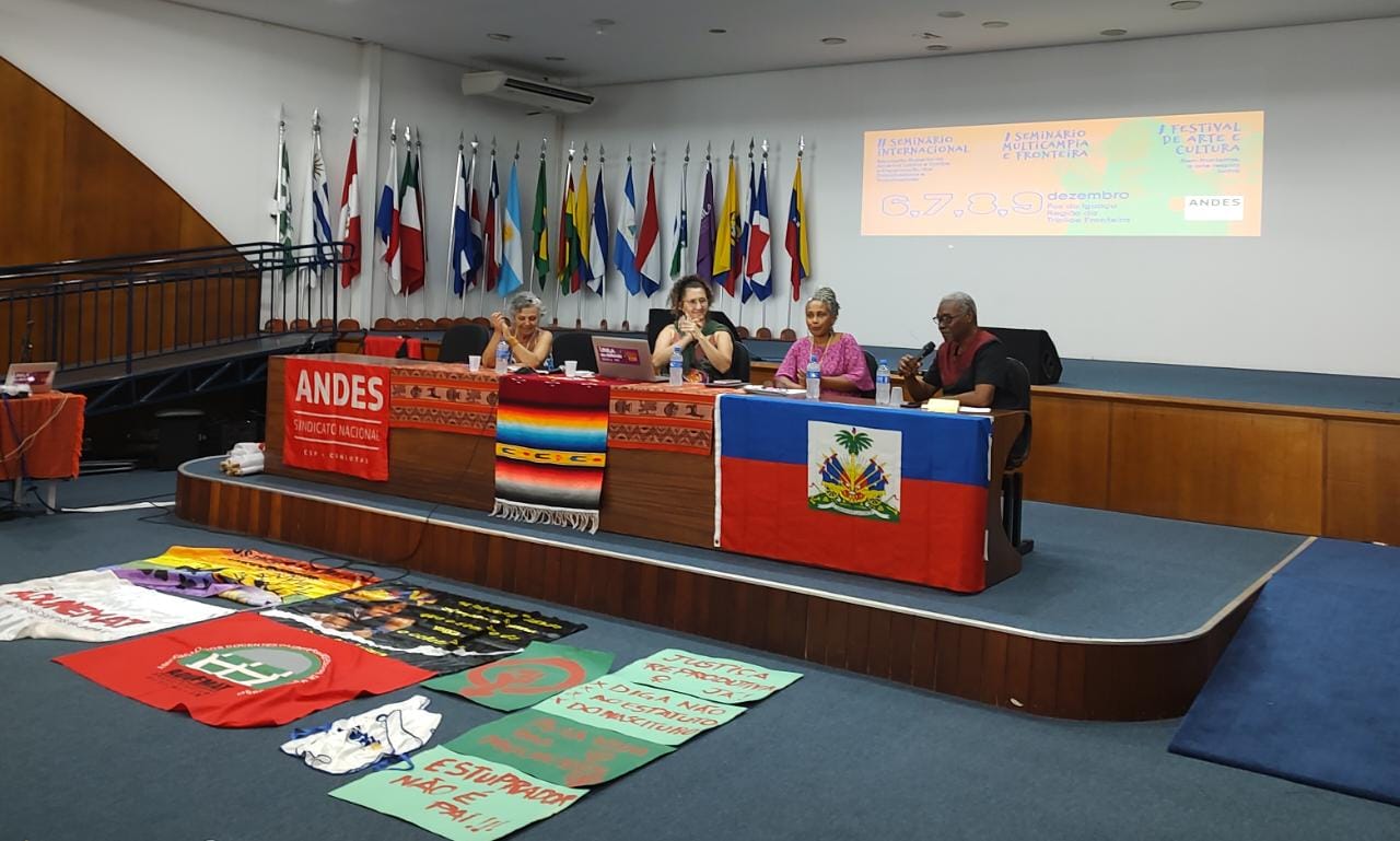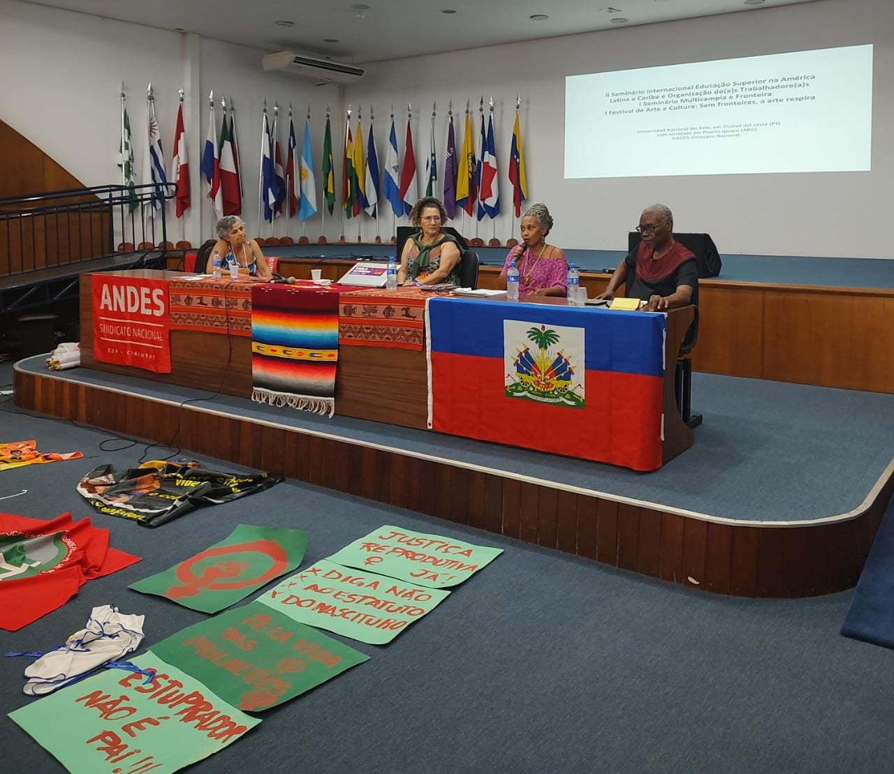 Na sequência, aconteceu a quarta mesa de debate, com o tema "Universidade e lutas dos povos originários e afrodescendentes", com Camille Chalmers (PAPDA/Haiti), Maria Raimunda (UFF/Brasil) e Senilde Guanaes (UNILA/Brasil). As apresentações trouxeram reflexões profundas sobre a presença dos povos originários e afrodescendentes nas universidades, a necessidade de mudanças estruturais na grade curricular e nas regras e epistemologias das instituições de ensino.