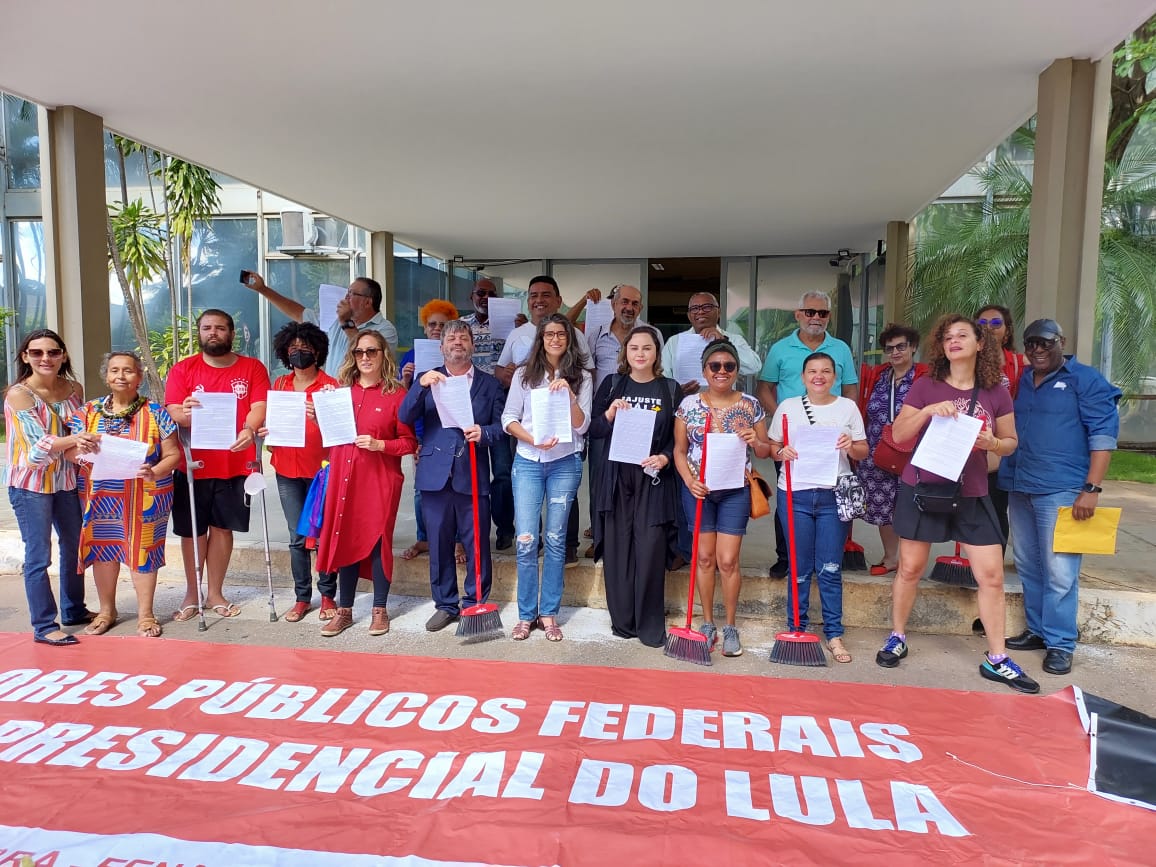 Além da lavagem simbólica, as e os dirigentes protocolaram ofício à ministra Esther Dweck (Gestão) e aos ministros Fernando Hadad (Fazenda) e Rui Costa (Casa Civil), reforçando a necessidade de o governo discutir a recomposição salarial da categoria, bem como abrir negociação sobre os demais itens da pauta unificada do funcionalismo federal, como os valores pagos a título de benefícios que estão congelados desde 2012.
