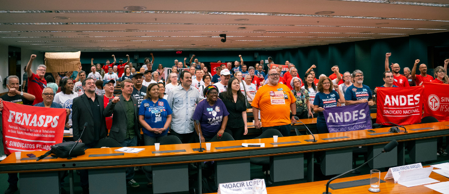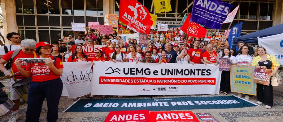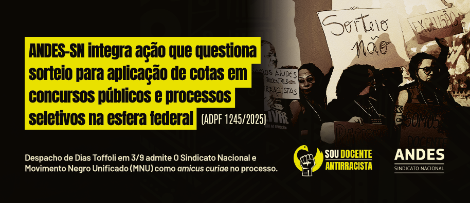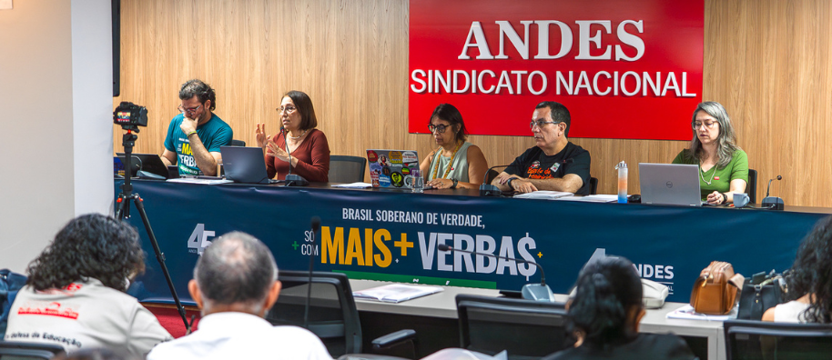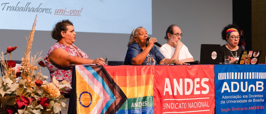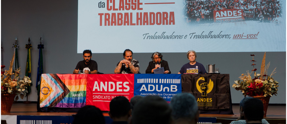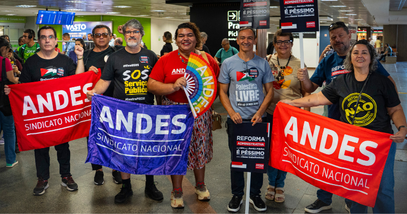 Dia 1 de agosto, o ANDES-SN marcou presença no ato em defesa da soberania nacional e contra o "tarifaço" de Donald Trump, em frente à Embaixada dos EUA, em Brasília (DF).