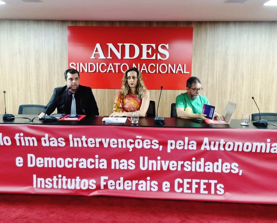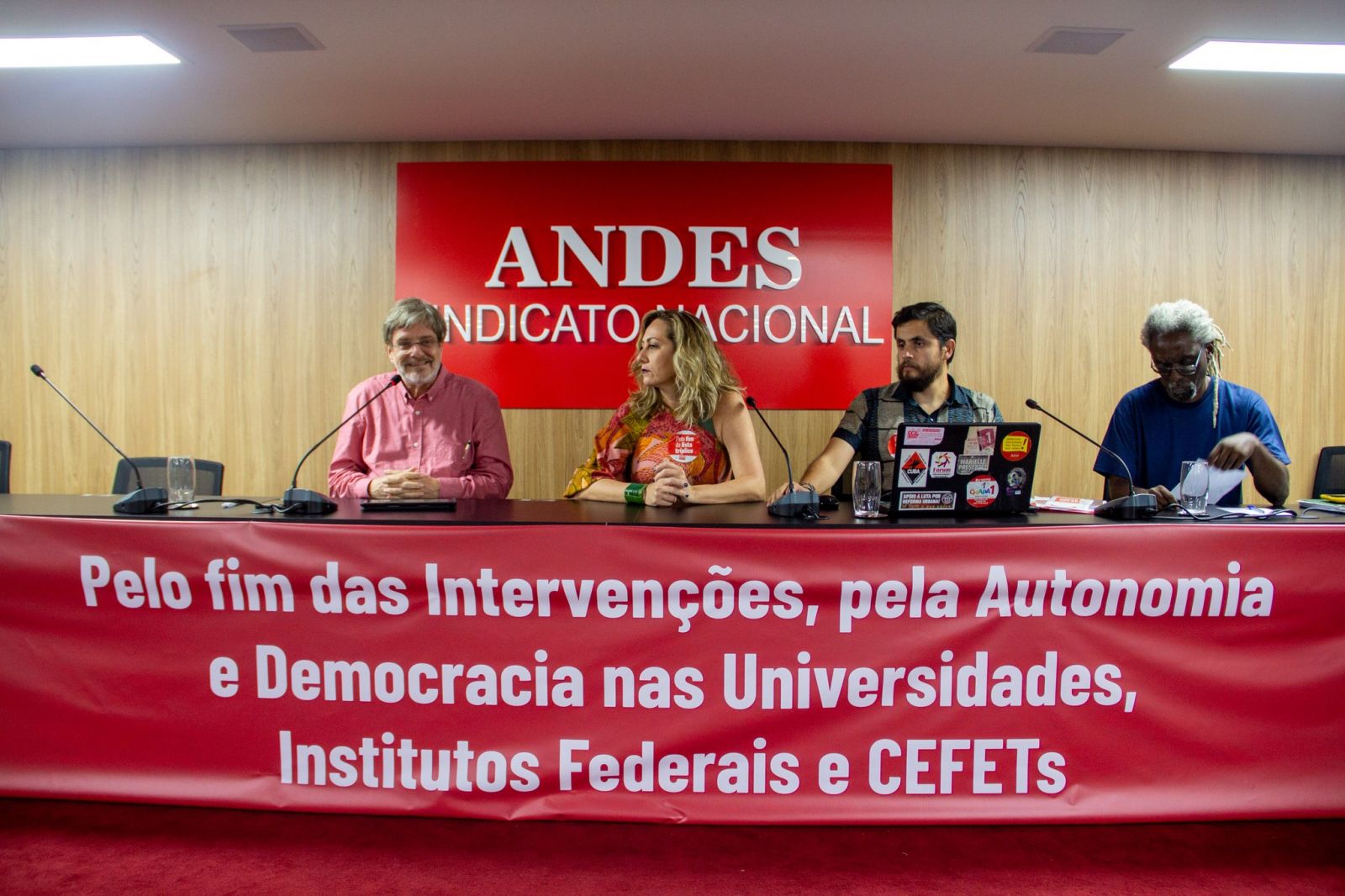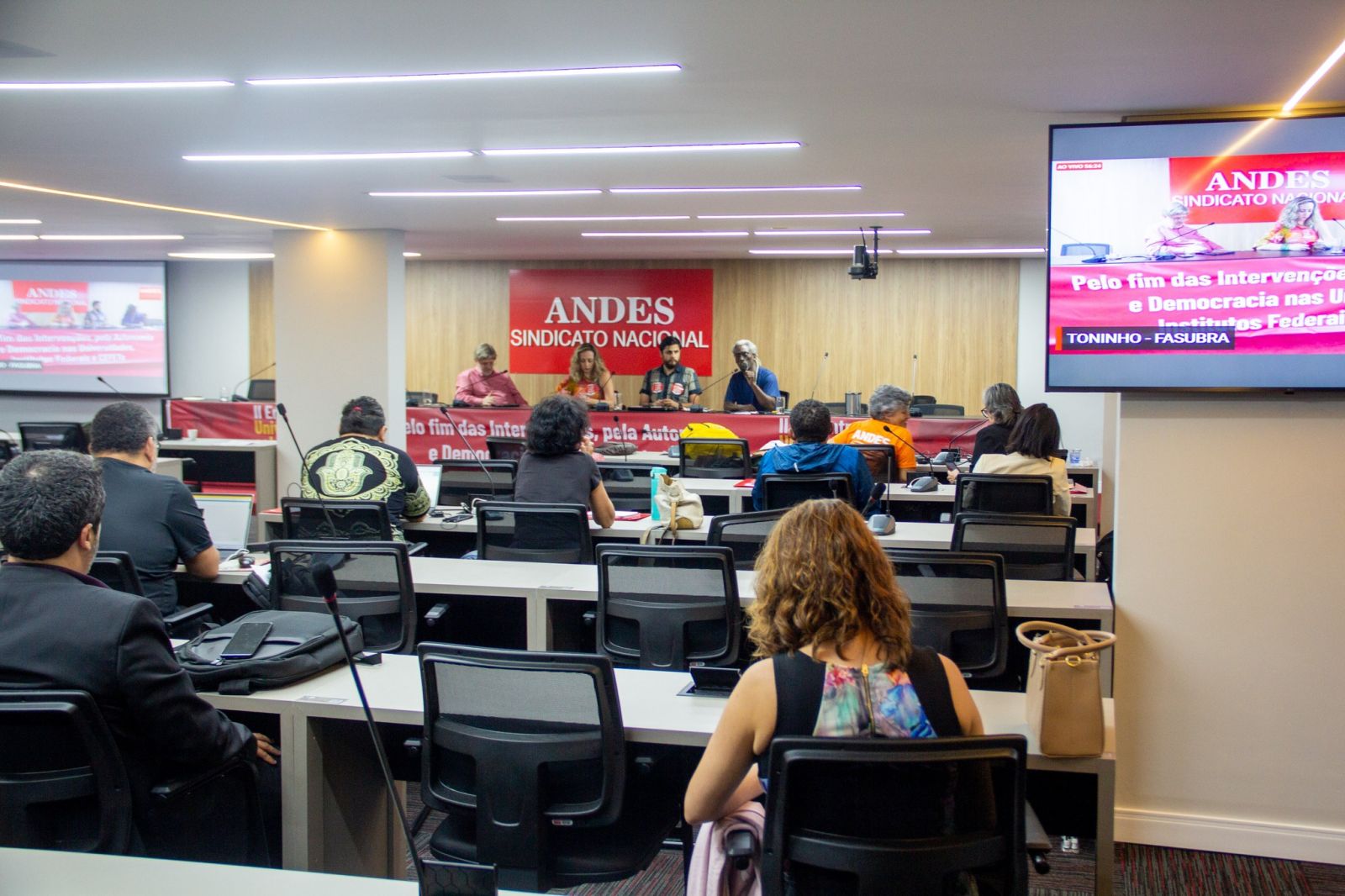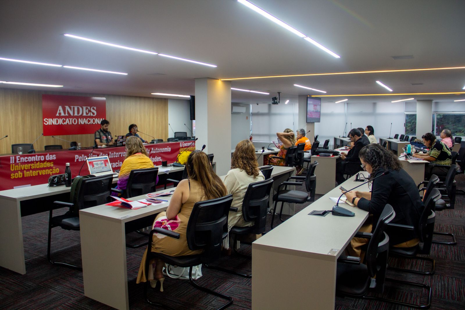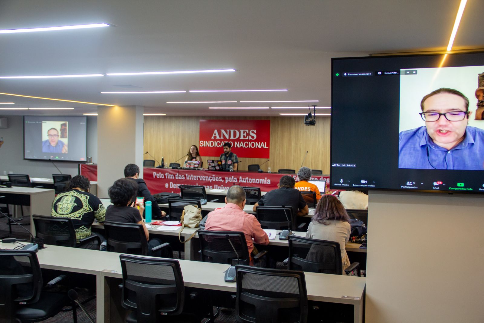 Os impactos das intervenções nas comunidades acadêmicas e a necessidade de acabar com o processo da lista tríplice para a escolha de reitores e reitoras nas instituições de ensino superior (IES) pública foram debatidos na terça-feira (4), no II Encontro Nacional das Universidades sob Intervenções. O evento foi realizado de forma híbrida na sede do ANDES-SN em Brasília (DF) e também com participações pela internet. A atividade marcou o Dia Nacional de Luta e Mobilização contra as Intervenções e pela Autonomia e Democracia nas Universidades, Institutos Federais e Cefets.