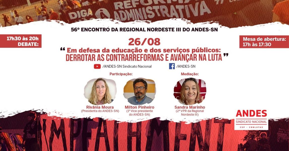 Entre os dias 26 e 28 de agosto será realizado, em plataforma na internet, o 56º Encontro da Regional Nordeste 3 do ANDES-SN. A atividade irá discutir a atual conjuntura de ataques às universidades públicas, institutos federais e cefets, tanto pelo governo federal, como também pelos governos estaduais, que estão aplicando cortes nos orçamentos destinados à Educação e, também, atacando os salários e as carreiras do funcionalismo público.